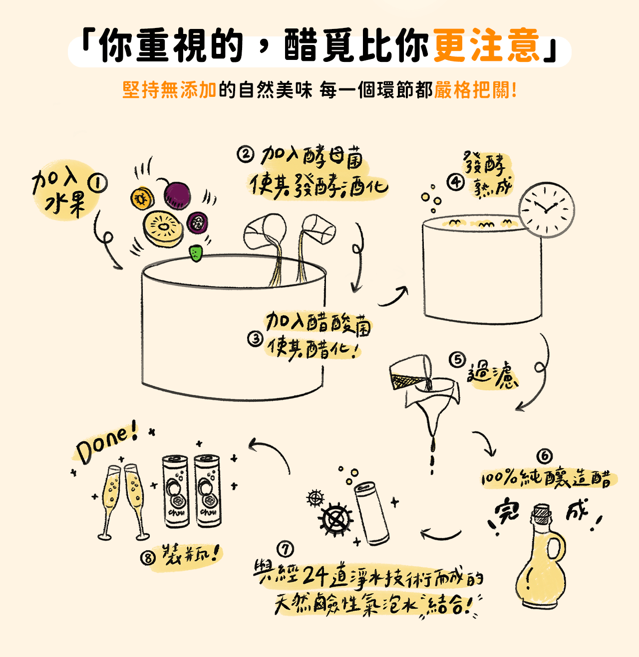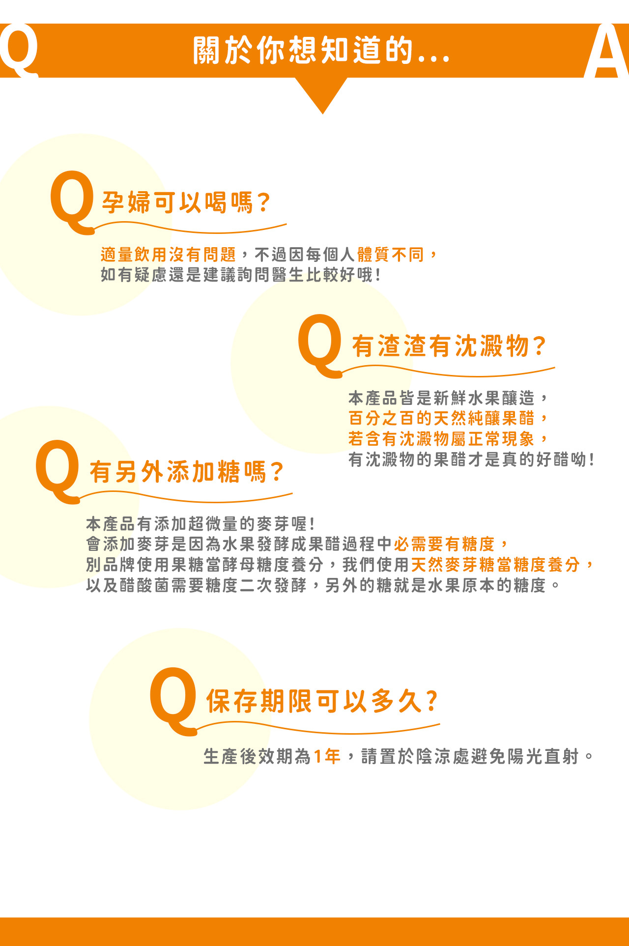 注意事項:本商品含有強制性標示過敏原成分;另本產品使用純釀鮮果醋,有些水果醋的微沉澱物屬正常現象,請安心飲用。